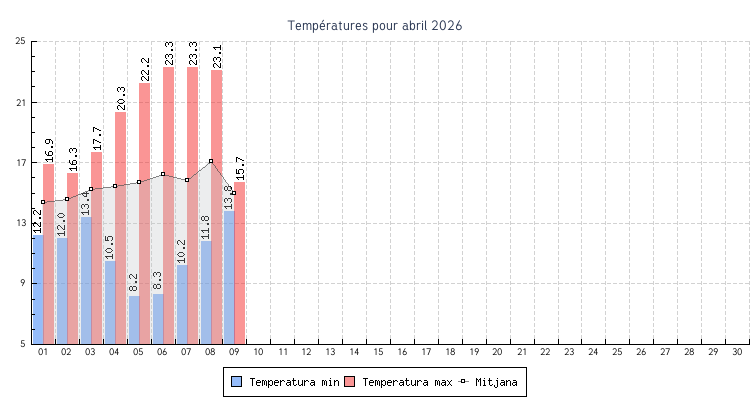 | 08 | 11.8 °C | 23.1 °C | 17.1 °C | 4.2 km/h (22.5 km/h) | ENE |