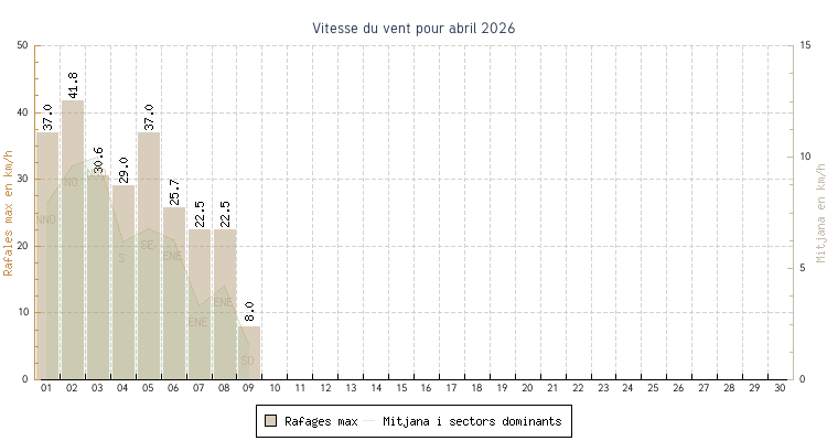 | min | max | mitjana | Velocitat (rafages) | Sector | ||