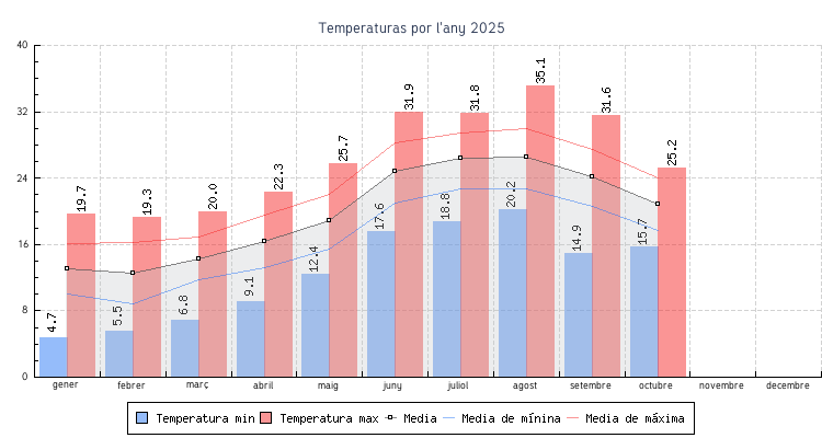 | Mes | Temperatures min | Temperatures max | Mitjana mensual |