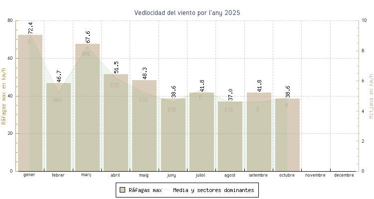 | octubre | 15.7 °C | 17.7 °C | 25.2 °C | 24.0 °C | 20.8 °C | 4.9 km/h | 38.6 km/h | N |