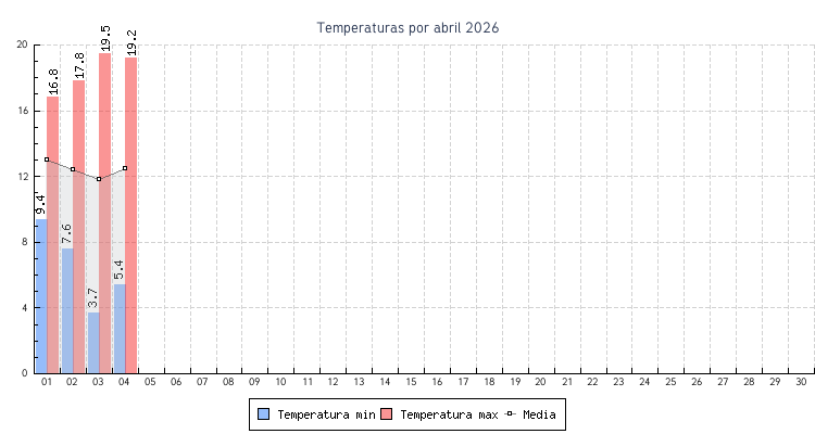 | 03 | 3.7 °C | 19.5 °C | 11.8 °C | 12.6 km/h (64.4 km/h) | N |