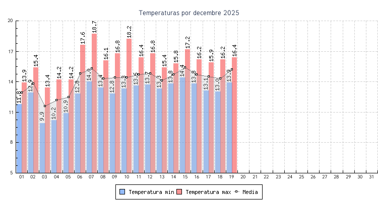 | 09 | 12.8 °C | 16.8 °C | 14.4 °C | 12.4 km/h (24.1 km/h) | SSO |