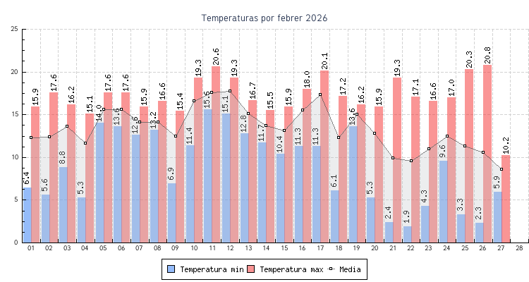 | 01 | 6.4 °C | 15.9 °C | 12.3 °C | 4.5 km/h (25.7 km/h) | OSO |