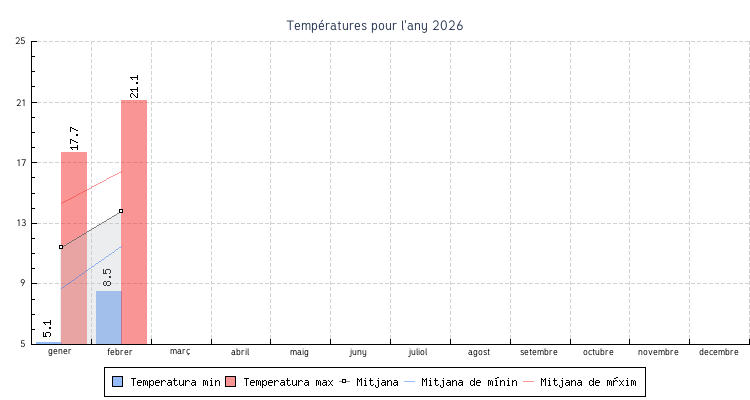 | Mes | Temperatures min | Temperatures max | Mitjana mensual |