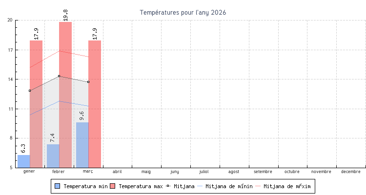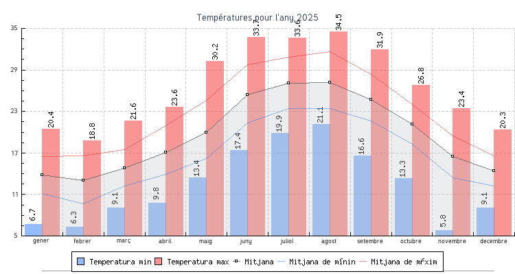 | Mes | Temperatures min | Temperatures max | Mitjana mensual |