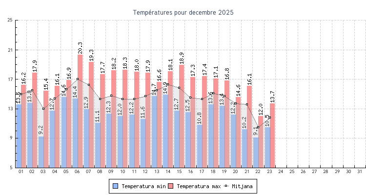| 09 | 12.3 °C | 18.2 °C | 14.8 °C | 6.2 km/h (25.7 km/h) | SSO |