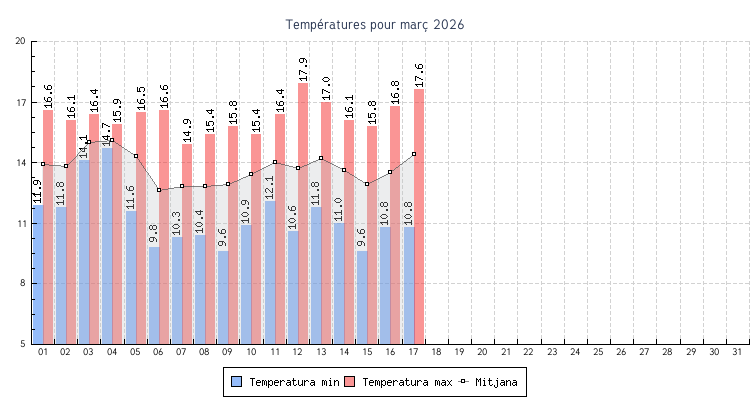 | 16 | 10.8 °C | 16.8 °C | 13.5 °C | 11.1 km/h (30.6 km/h) | NO |