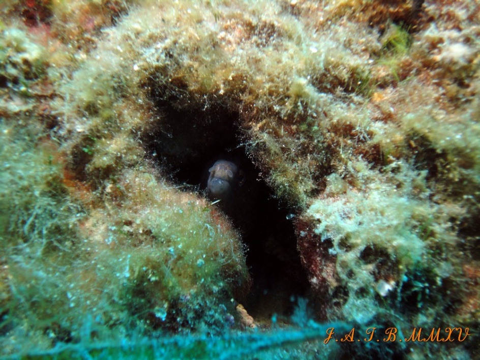 Detalle de una pequeña morena semi oculta en una pequeña grieta.
