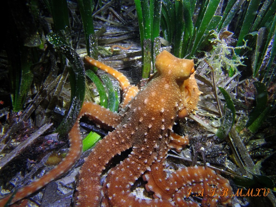 Estos ejemplares de pulpos solo son observables en inmersiones nocturnas, se deslizan entre la posidonia en busca de alimento.