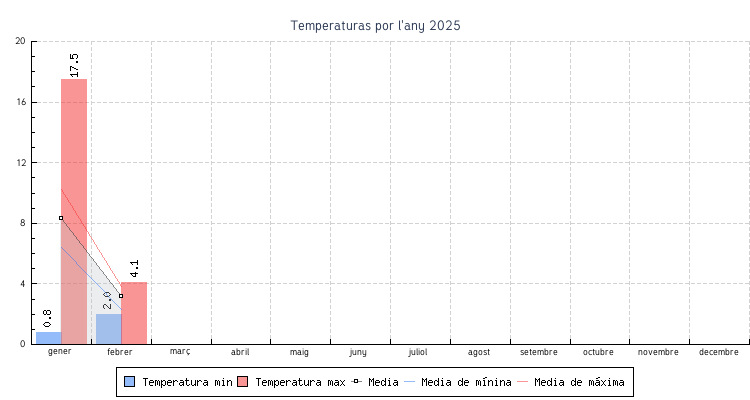 | febrer | 2.0 °C | 2.3 °C | 4.1 °C | 3.8 °C | 3.2 °C | 7.1 km/h | 35.4 km/h | SE |