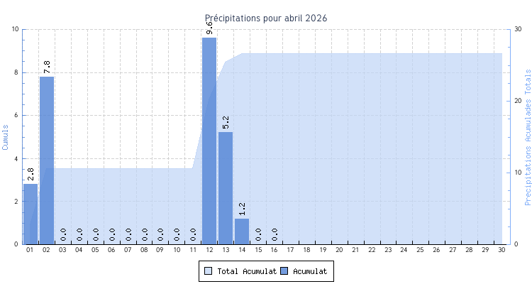 | 02 | 6.8 °C | 15.8 °C | 11.1 °C | 0.0 km/h (1.6 km/h) | NNE |