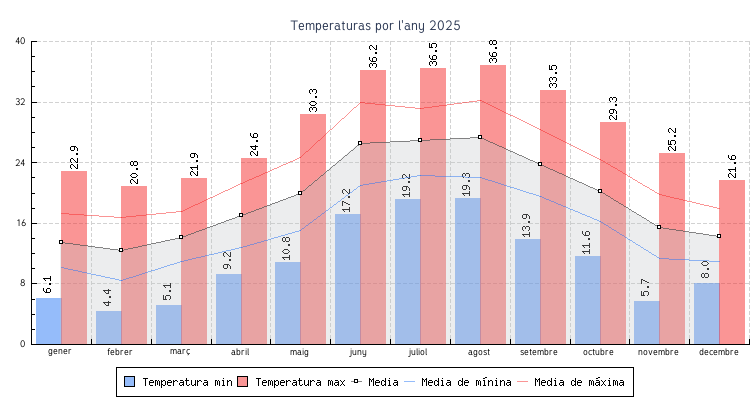 | Mes | Temperatures min | Temperatures max | Mitjana mensual |