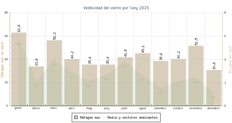 | gener | 6.1 °C | 10.2 °C | 22.9 °C | 17.3 °C | 13.4 °C | 5.7 km/h | 62.8 km/h | ENE |
