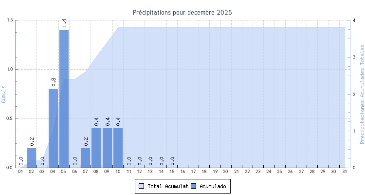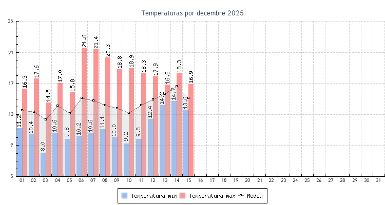 | 15 | 13.6 °C | 16.9 °C | 15.1 °C | 0.0 km/h (6.4 km/h) | N |