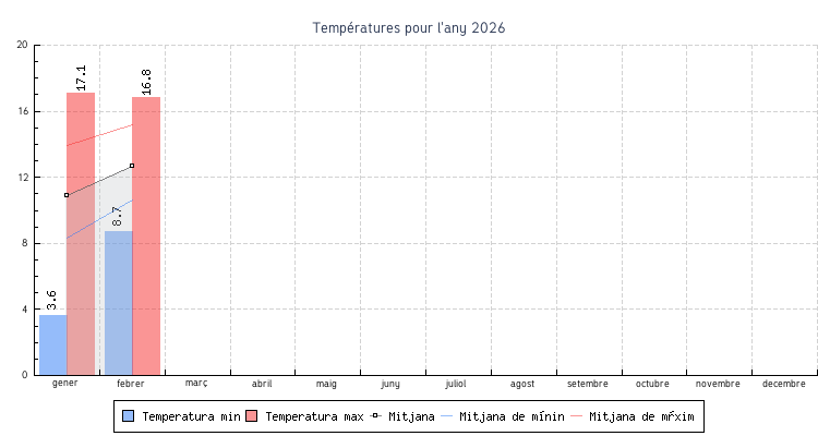 | Mes | Temperatures min | Temperatures max | Mitjana mensual |
