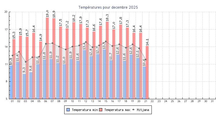 | 06 | 11.8 °C | 19.0 °C | 14.5 °C | 4.1 km/h (25.7 km/h) | SSO |