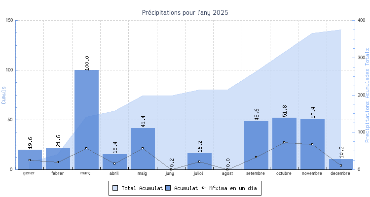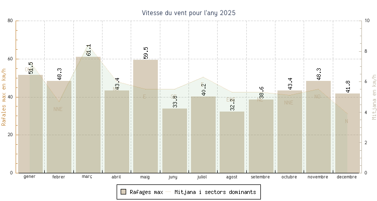| maig | 9.7 °C | 14.3 °C | 26.1 °C | 22.7 °C | 18.9 °C | 5.5 km/h | 59.5 km/h | E |