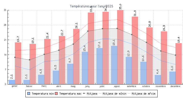 | Mes | Temperatures min | Temperatures max | Mitjana mensual |
