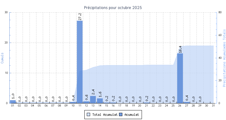 | Total | 10.6 °C | 26.8 °C | 19.6 °C | 5.1 km/h (43.4 km/h) | 50.6 mm | |