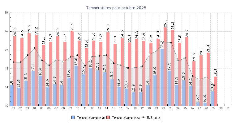 | 01 | 14.4 °C | 24.9 °C | 19.4 °C | 2.5 km/h (22.5 km/h) | NNE |