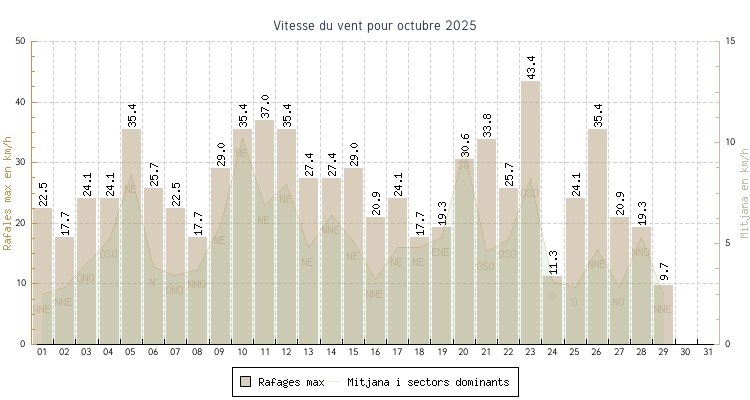 | min | max | mitjana | Velocitat (rafages) | Sector | ||