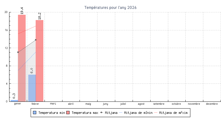 | Mes | Temperatures min | Temperatures max | Mitjana mensual |