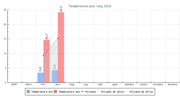| Mes | Temperatures min | Temperatures max | Mitjana mensual |