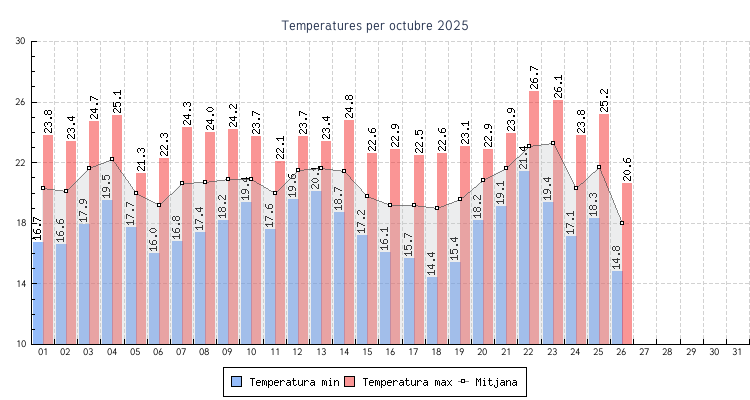 | 01 | 16.7 °C | 23.8 °C | 20.3 °C | 6.5 km/h (27.4 km/h) | NNO |