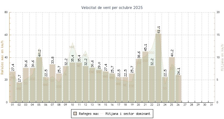 | min | max | mitjana | Velocitat (rafages) | Sector | ||