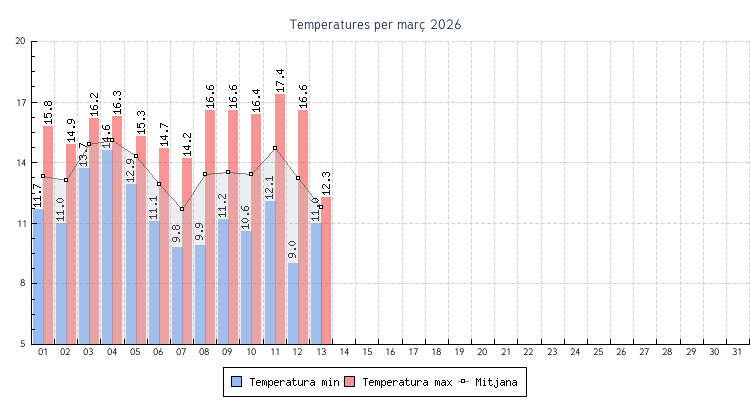 | 11 | 12.1 °C | 17.4 °C | 14.7 °C | 4.7 km/h (20.9 km/h) | N |