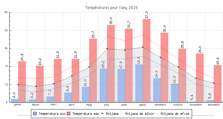 | Mes | Temperatures min | Temperatures max | Mitjana mensual |