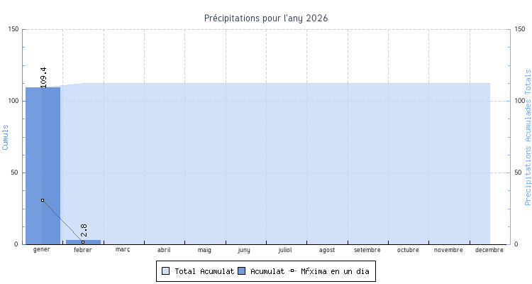 | febrer | 8.4 °C | 9.8 °C | 18.5 °C | 14.7 °C | 12.0 °C | 12.4 km/h | 85.3 km/h | O |