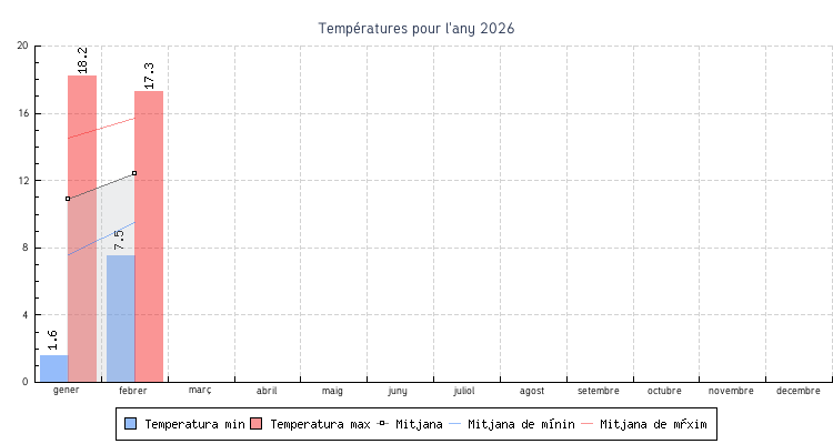 | Mes | Temperatures min | Temperatures max | Mitjana mensual |
