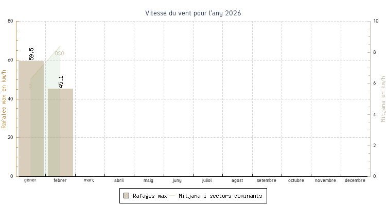 | febrer | 7.5 °C | 9.5 °C | 17.3 °C | 15.7 °C | 12.4 °C | 8.4 km/h | 45.1 km/h | OSO |