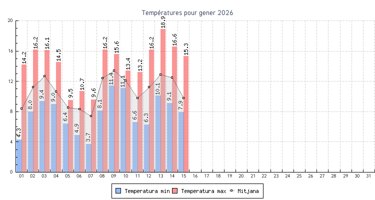| 01 | 4.3 °C | 14.2 °C | 8.4 °C | 1.3 km/h (19.3 km/h) | SE |