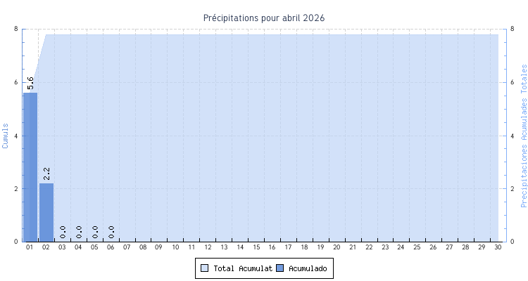 | Total | 8.3 °C | 21.9 °C | 13.6 °C | 5.3 km/h (48.3 km/h) | 7.8 mm | |