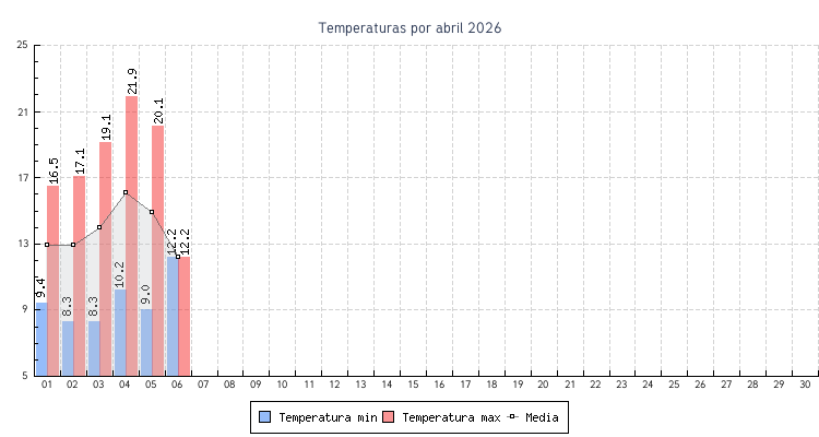 | 01 | 9.4 °C | 16.5 °C | 12.9 °C | 10.1 km/h (48.3 km/h) | NNO |