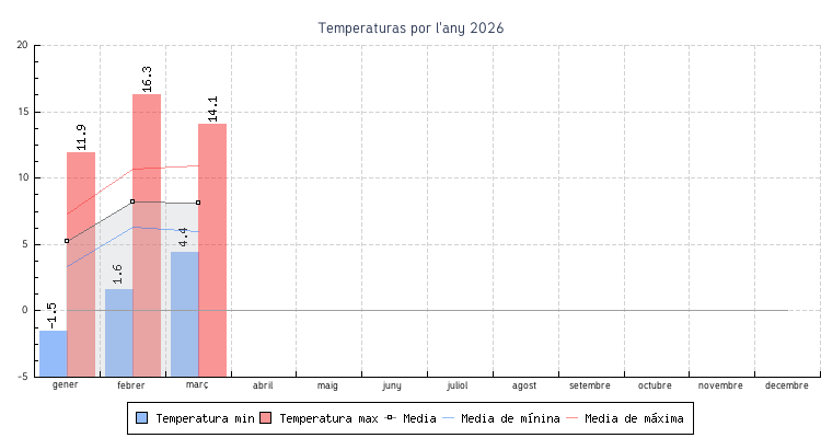| Mes | Temperatures min | Temperatures max | Mitjana mensual |