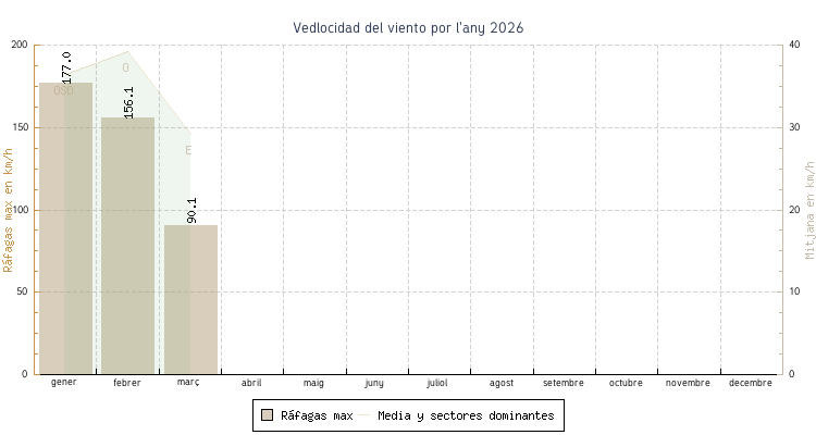 | febrer | 1.6 °C | 6.3 °C | 16.3 °C | 10.7 °C | 8.2 °C | 39.2 km/h | 156.1 km/h | O |