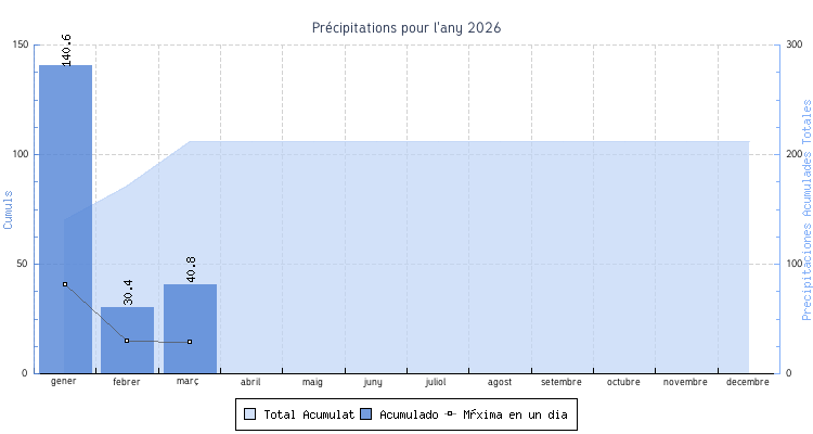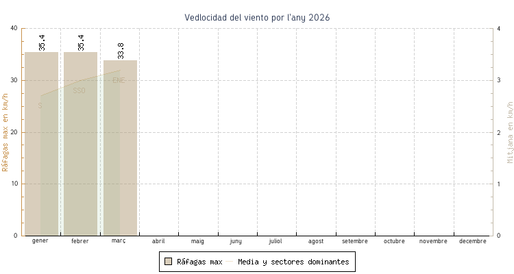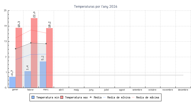 | febrer | 1.4 °C | 8.0 °C | 22.0 °C | 17.5 °C | 12.4 °C | 3.0 km/h | 35.4 km/h | SSO |