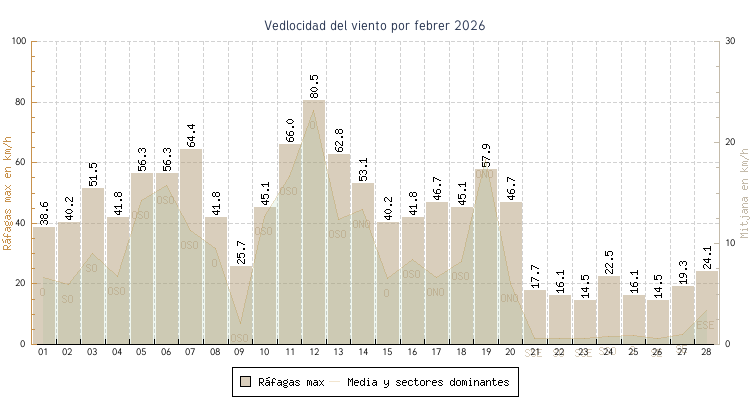 | min | max | mitjana | Velocitat (rafages) | Sector | ||