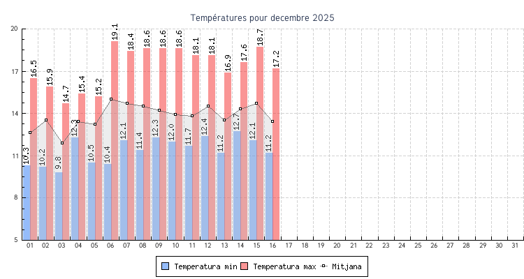 | 09 | 12.3 °C | 18.6 °C | 14.2 °C | 3.6 km/h (17.7 km/h) | SSO |