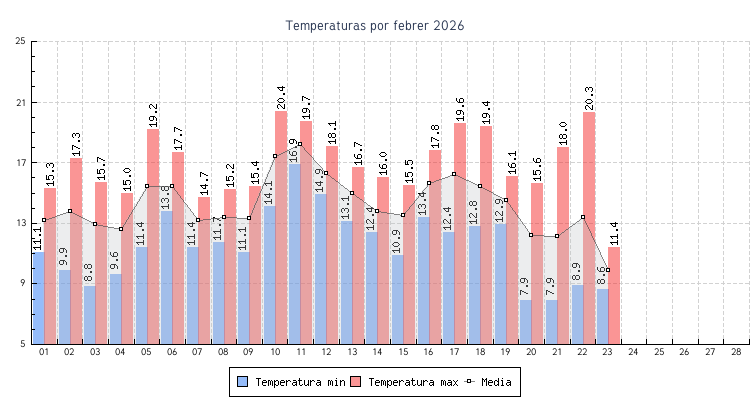 | 23 | 8.6 °C | 11.4 °C | 9.9 °C | 0.2 km/h (6.4 km/h) | NO |