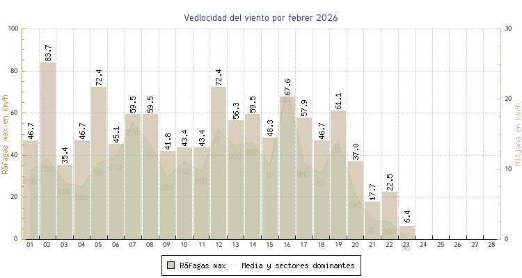 | min | max | mitjana | Velocitat (rafages) | Sector | ||