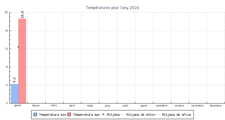 | Mes | Temperatures min | Temperatures max | Mitjana mensual |