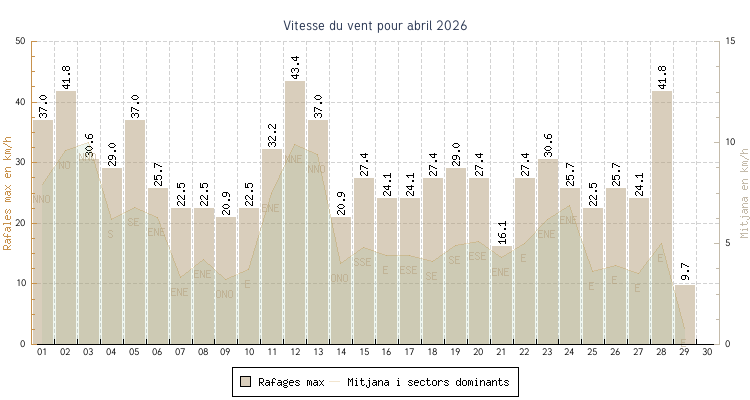 | min | max | mitjana | Velocitat (rafages) | Sector | ||