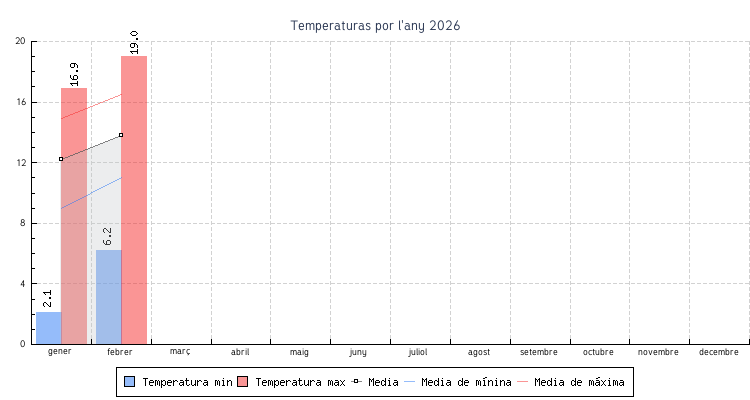 | Mes | Temperatures min | Temperatures max | Mitjana mensual |