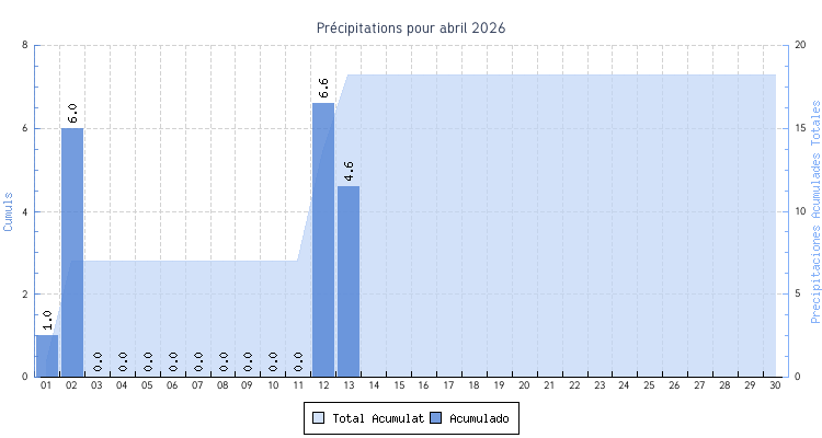 | Total | 7.6 °C | 24.3 °C | 15.1 °C | 7.2 km/h (57.9 km/h) | 18.2 mm | |