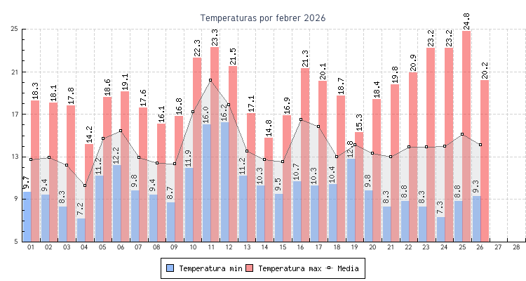 | 26 | 9.3 °C | 20.2 °C | 14.1 °C | 5.2 km/h (22.5 km/h) | ENE |