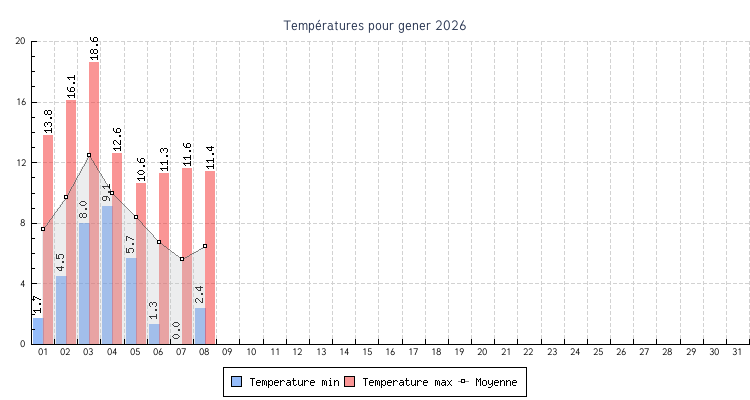 | Total | 0.0 °C | 18.6 °C | 8.4 °C | 11.7 km/h (48.3 km/h) | 11.4 mm | |